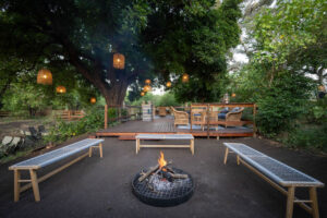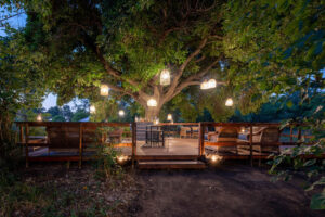 The lodge includes a luxury undercover communal lounge, with extended lounge area with gazebos and pergolas, hanging chairs, in the river bed, along with a bar area, campfire, dining area and swimming pool.