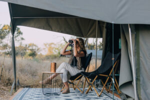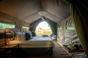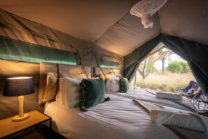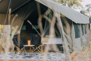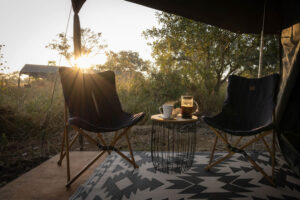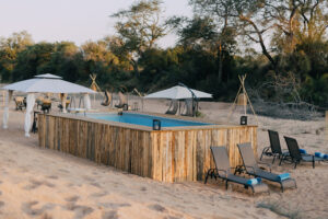 Close to Skukuza, in the heart of the Kruger, Tshokwane River Camp is located on the seasonal Ripape River with outstanding game viewing all year round. There are 15 luxury tents each positioned to provide privacy and great views overlooking the dry river bed. The glamping canvas tents offer simple luxury, The tents are spacious with luxurious linen, bedside tables, dressing room, ensuite bathroom with safari shower filled with hot water twice a day and ethereal mosquito nets.